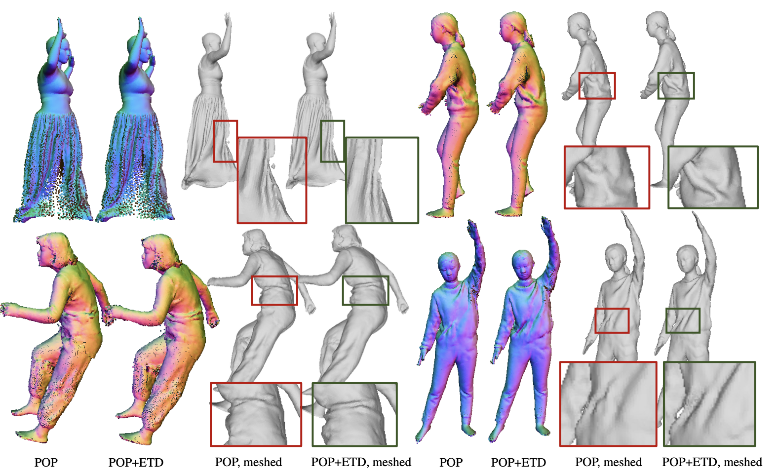 Fig 4. Comparison of the clothing deformation in unseen poses. Explicit template decomposition (ETD) helps to capture more natural pose-dependent wrinkle details than POP.