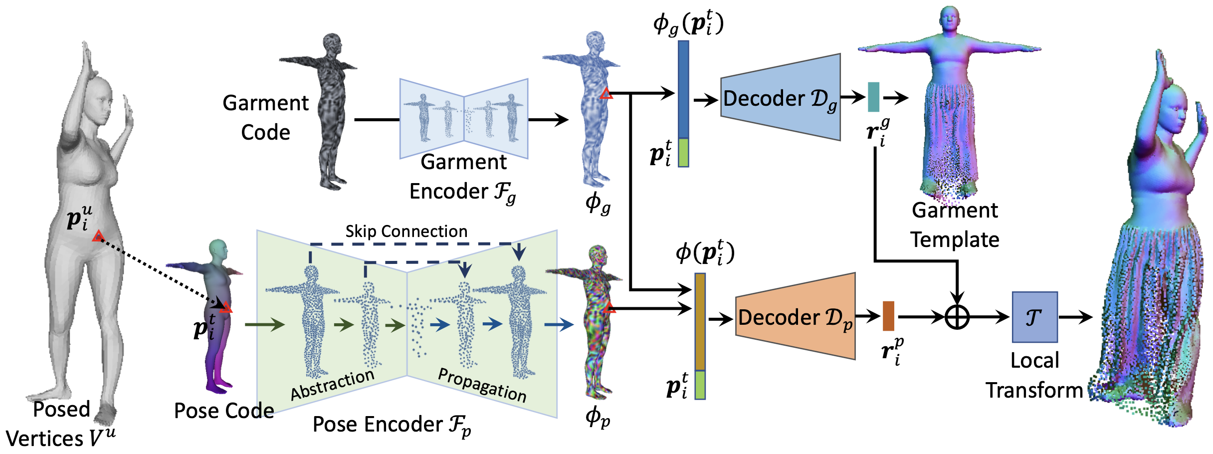 Fig 1. Overview. Given an input body model, its pose code and garment code are processed hierarchically by point-based pose and garment encoders for the learning of surface features. For any point lying on the template surface, its features are sampled from surface features accordingly and fed into two decoders for the prediction of the explicit garment template and pose-dependent wrinkle displacements, which will be combined and transformed to the clothing point cloud.